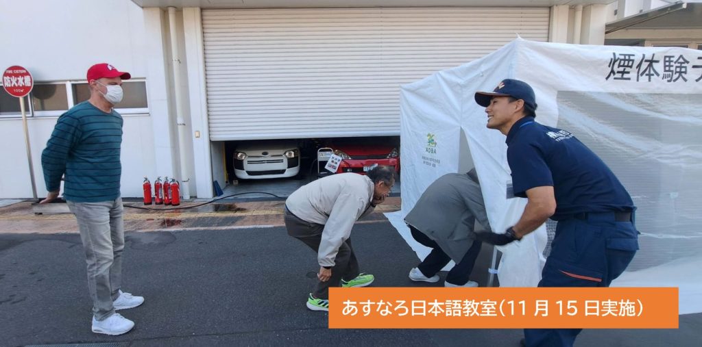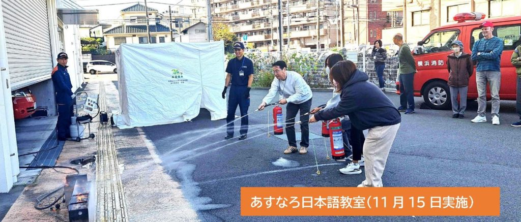 【開催報告】外国人のための防災ワークショップ 2025年11月25日 2025年11月27日 イベント・こうざ 7月、10月、11月、緑区内にある3つの日本語教室で、緑消防署のご協力をいただき防災ワークショップを開催しました。 ~消火器の使い方を体験(7月・10月・11月)~火災が発生したら・大きな声で「火事だ!」と周囲に知らせる・初期消火を試みる・火が大きくなってきたら無理をしないで安全に非難するという基本行動を確認しました。そして、実際に消火器を操作し、いざというときに、スムーズに落ち着いて行動できるよう練習しました。 ~地震の揺れを体感(7月・10月)~起震車に乗り、大きな揺れを体感しました。起震車にはテーブルとイスが設置されており、リアルな設定の中で、身(頭)を守るを方法を学びました。参加者からは「実際に体験すると怖さがよく分かる」との声がありました。 ~煙の中を非難する練習(11月)~火災時に発生する煙には有害なものが含まれています。煙の充満するテントの中に入り、視界が悪い中で、ハンカチなどで鼻と口をおおい、床に近い姿勢で避難する練習をしました。参加者は「部屋の中は煙で全く何も見えなかった」「煙の怖さを実感した」と話していました。 ~みんなで意見交換(7月・10月・11月)~防災士の方から国内の地震被害の事例を紹介いただき、自宅や買い物中、屋外など状況別にどう行動すべきか参加者全員で考えました。地震の備えについても話し合い、外国人と日本人が互いの視点を共有する貴重な時間となりました。 起震車や初期消火などの体験に加え、参加者全員で意見交換を行うことで、外国人も日本人も一緒に学び合い、安心につながる時間となりました。