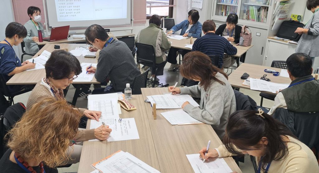 講師は、障害のある児童を支援する仕事と日本語ボランティア活動の両方に携わっており、「どちらも、繰り返し、ゆっくりと、寄り添って教えていくことが共通している」と話し、さらに「楽しくサポートすることがいちばん大切!」と伝えました。